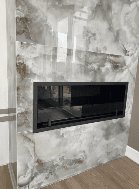 Декоративное стекло — крепится на всю заднюю стенку очага. За счет своего зеркального отражения, пламя визуально становится в 2 раза больше и кажется, что камин горит еще ярче.