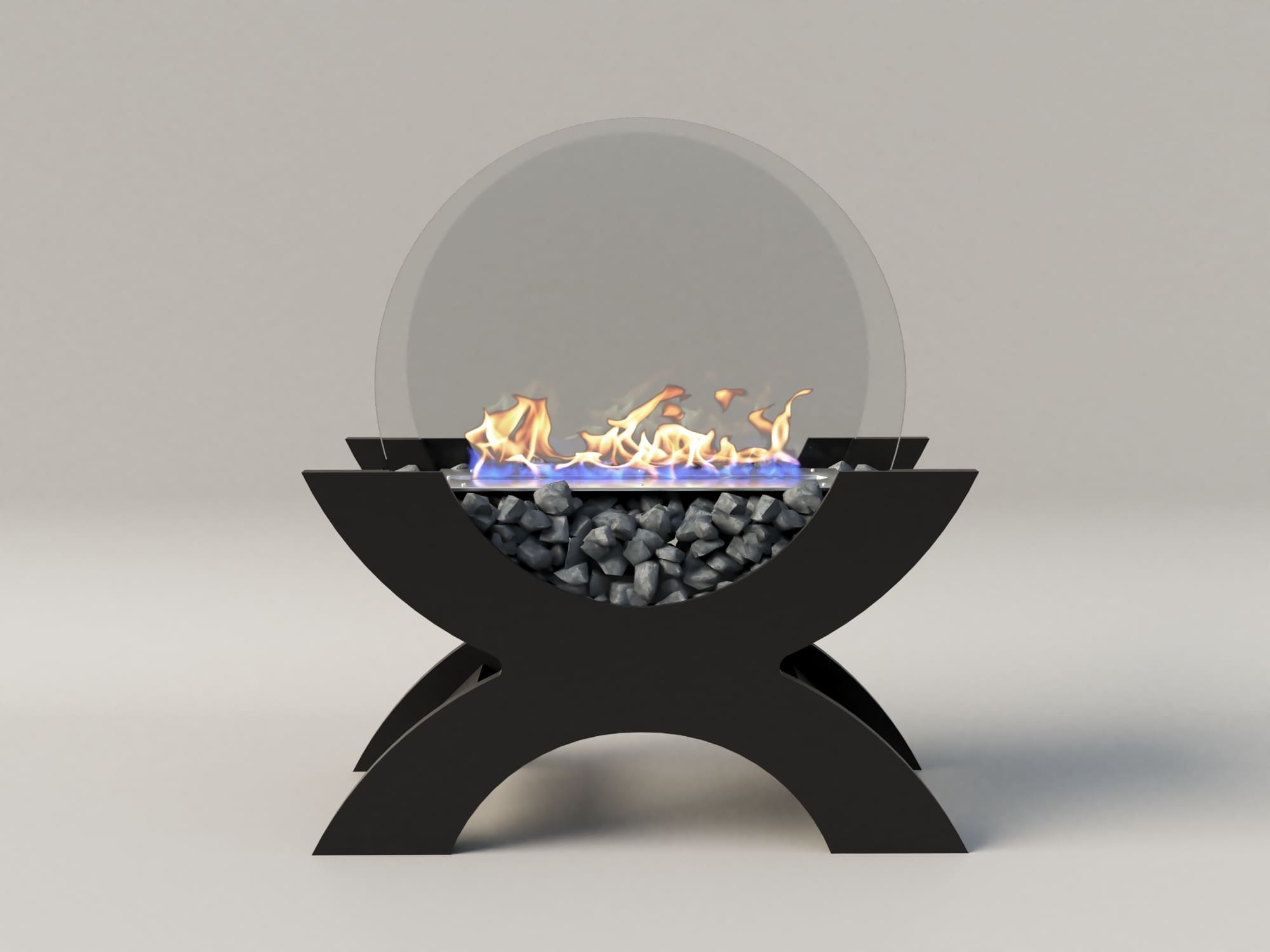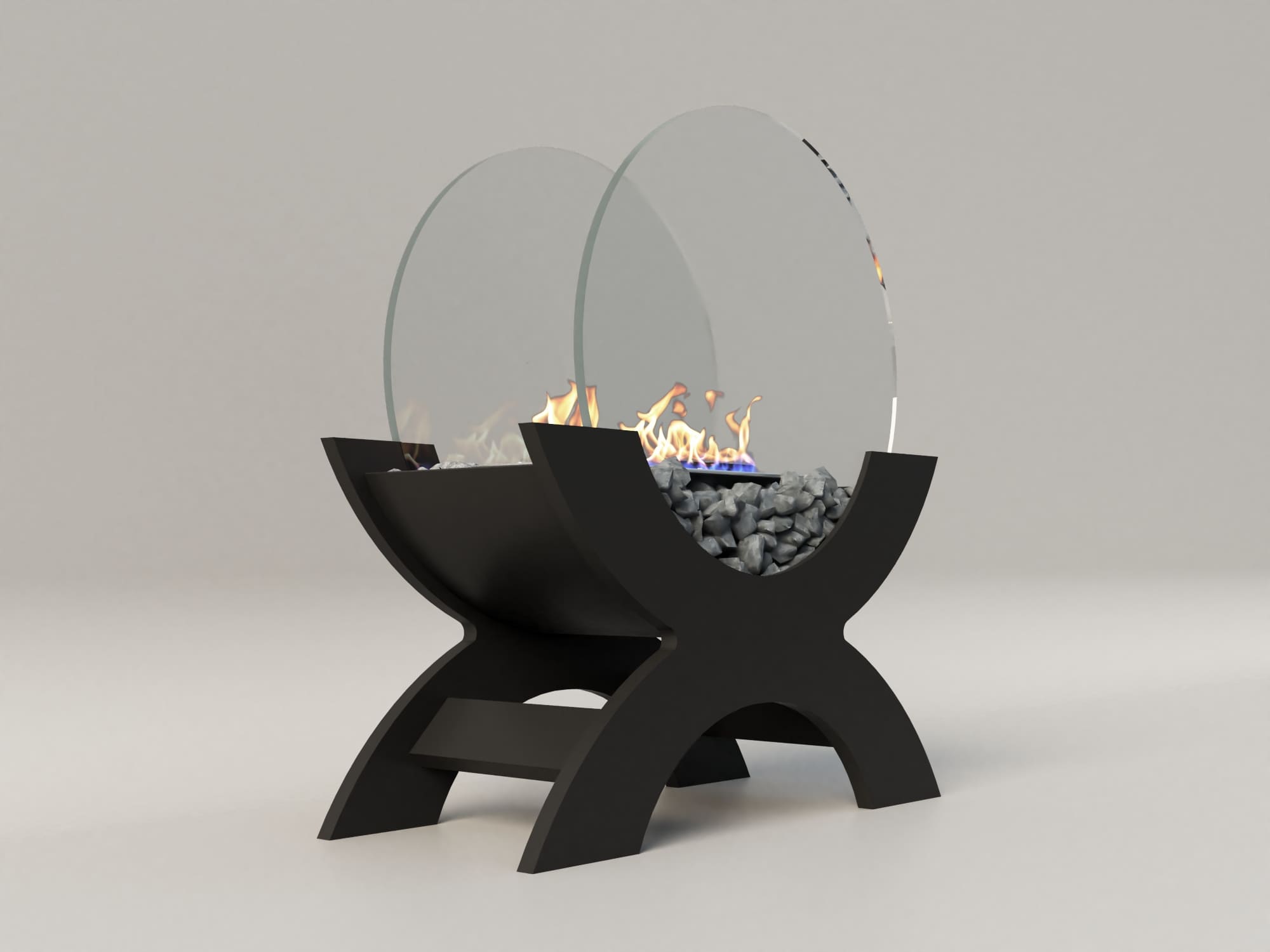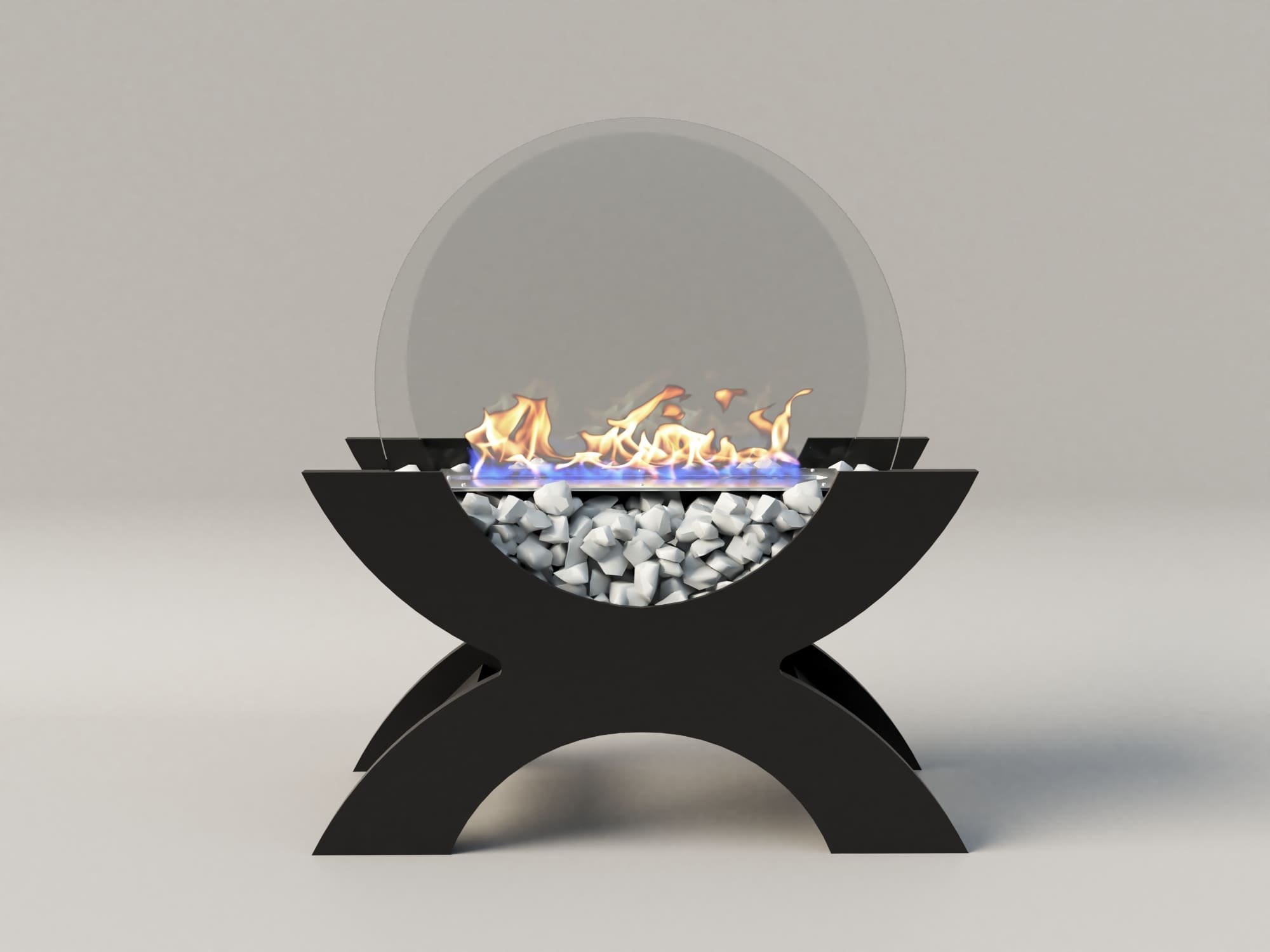 Переносной камин устанавливается на полу и не требует дымохода. Линия огня данного камина 300 мм, располагается практически по всей длине камеры сгорания. Основание биокамина — 100% сталь, ножки изготовлены из МДФ, топливный блок выполнен из высококачественной нержавеющей стали, наполнитель — керамическое волокно, а также закаленные жаропрочные стекла толщиной 6 мм, камни — галтованный мрамор.