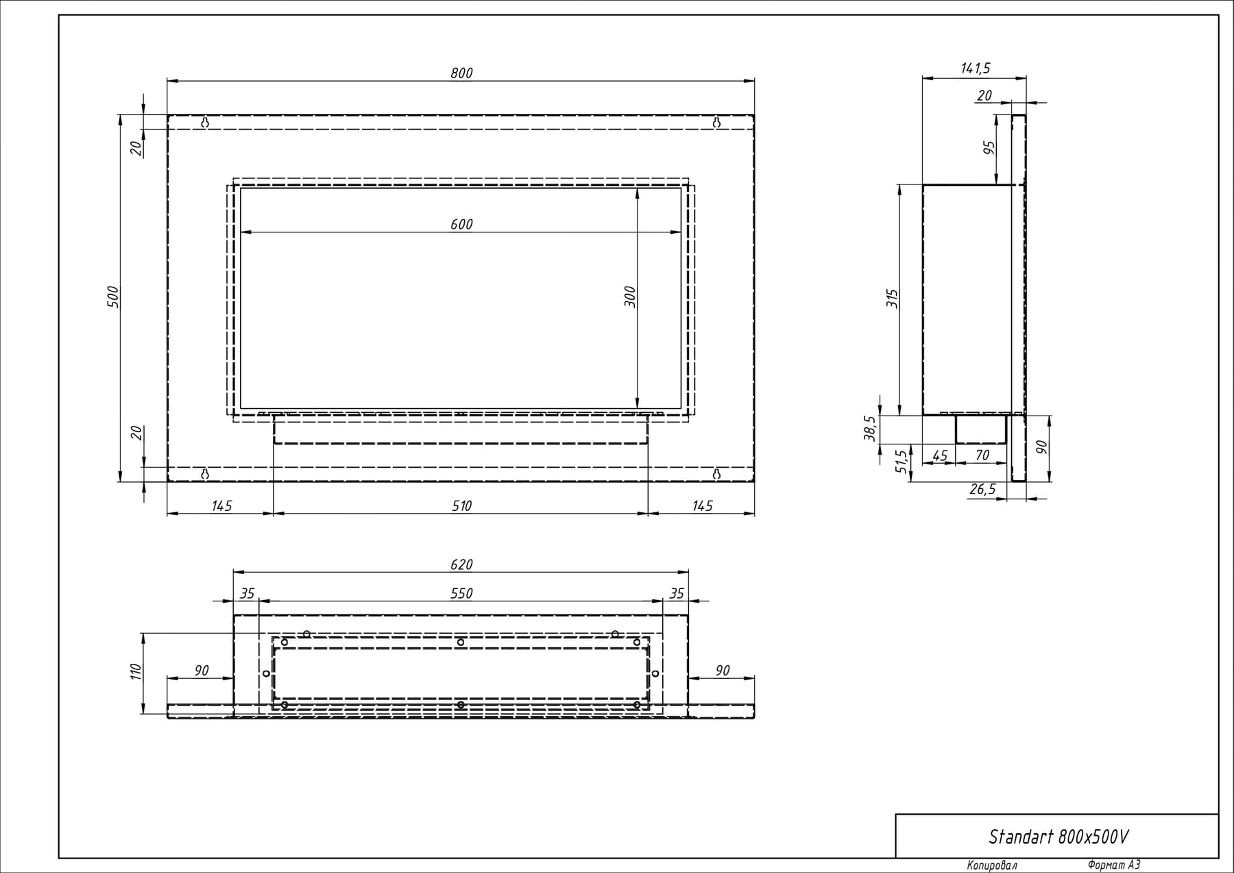 Встраиваемый биокамин «Лофт 800V» изготовлен из стали и нержавеющей стали, окрашен термостойкой порошковой краской.