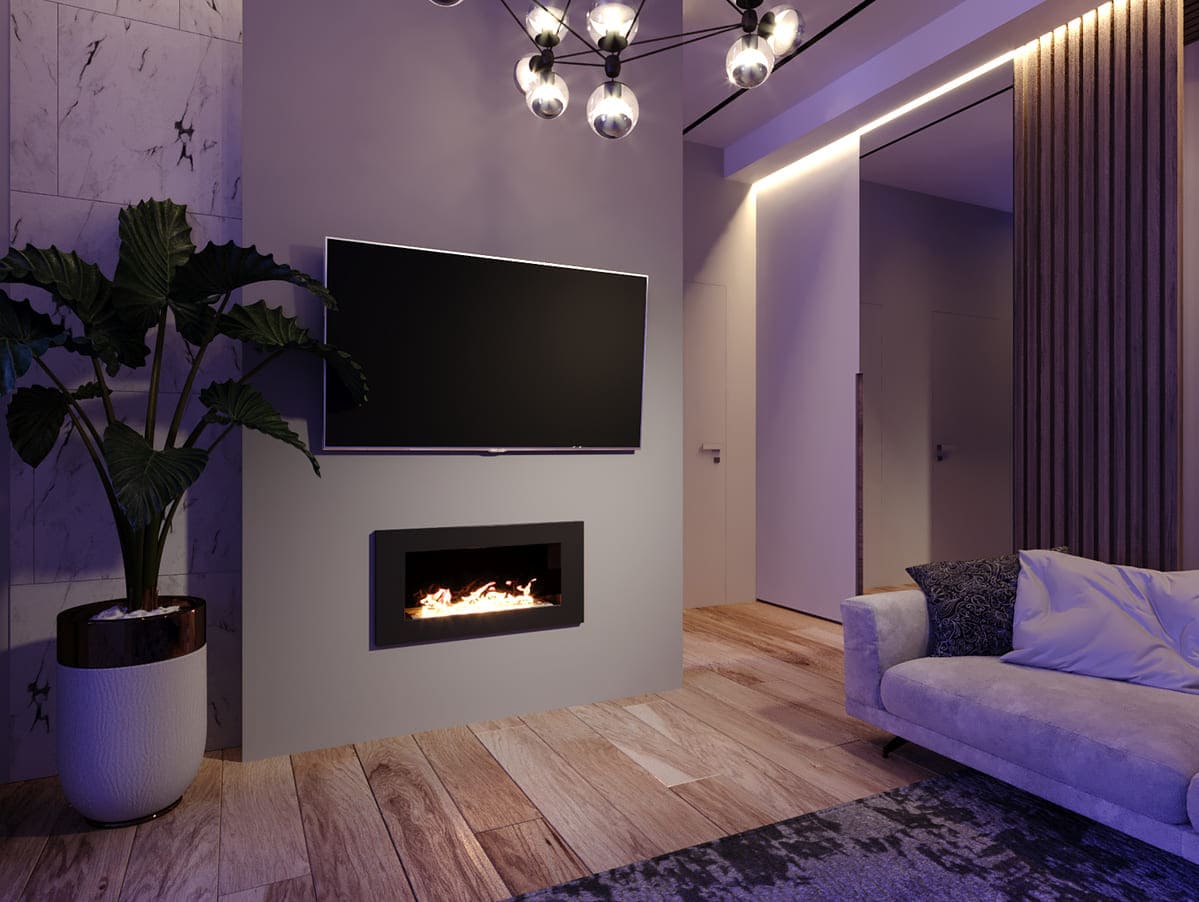 Декоративное стекло — крепится на всю заднюю стенку очага. За счет своего зеркального отражения, пламя визуально становится в 2 раза больше и кажется, что камин горит еще ярче.