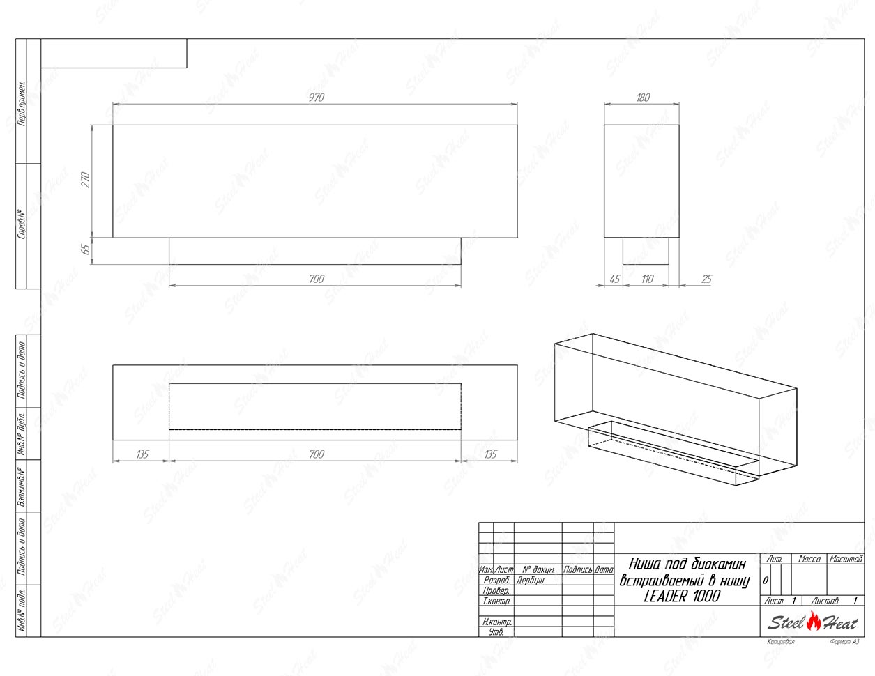 Встраиваемый Биокамин SteelHeat LEADER 1000 предназначен для встраивания в глухие ниши из гипсокартона, кирпича, пеноблоков, бетона.