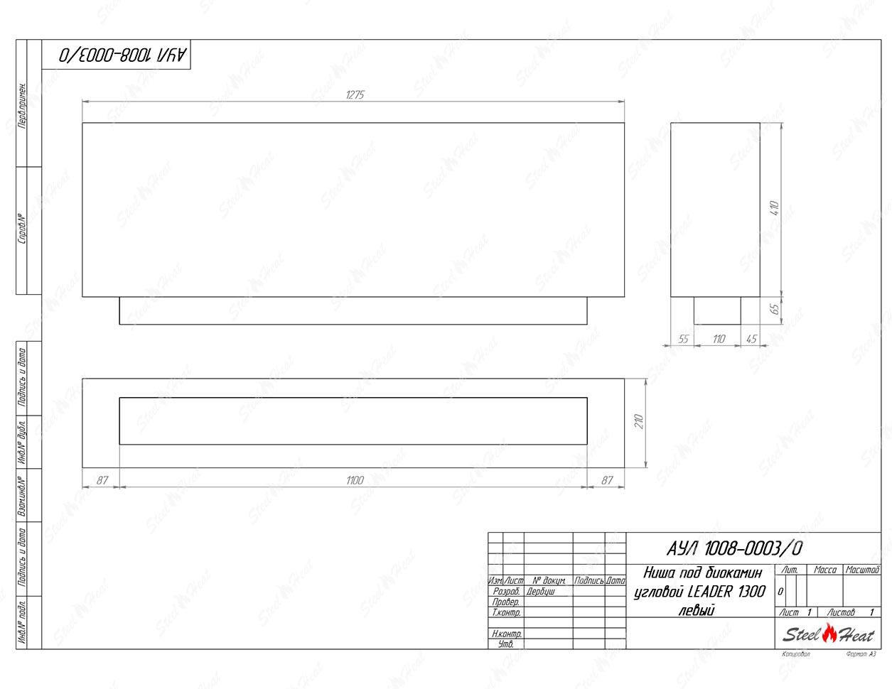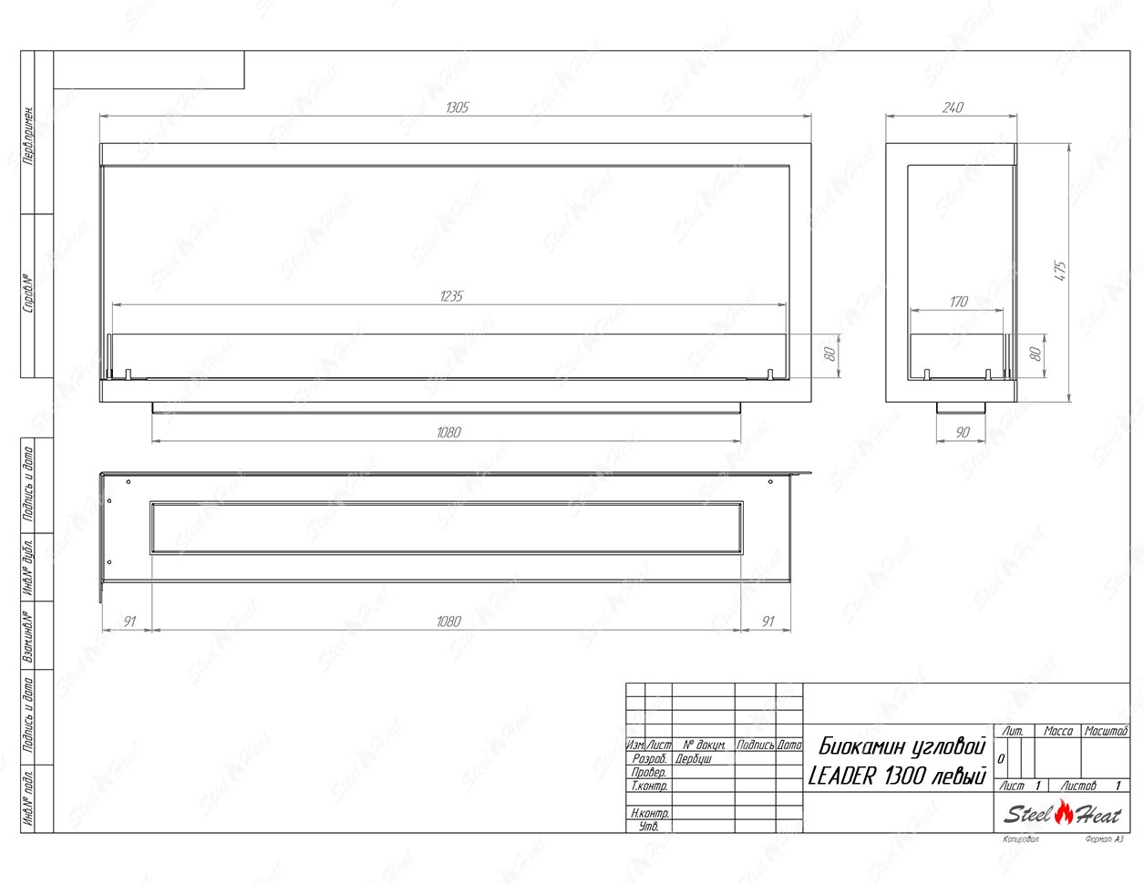 Встраиваемый Биокамин угловой SteelHeat Leader 1300 левый предназначен для встраивания в глухие ниши из гипсокартона, кирпича, пеноблоков, бетона.