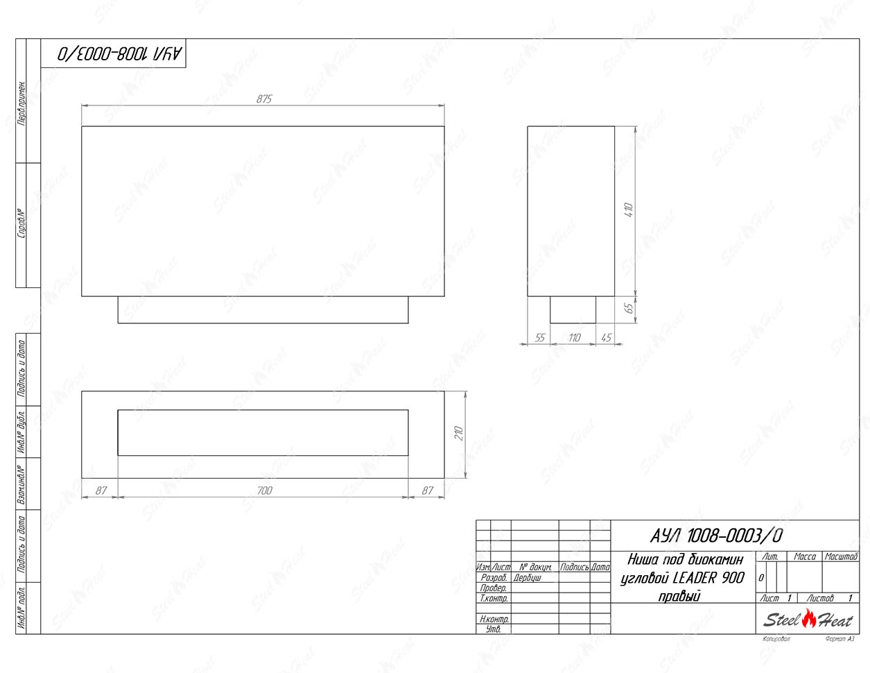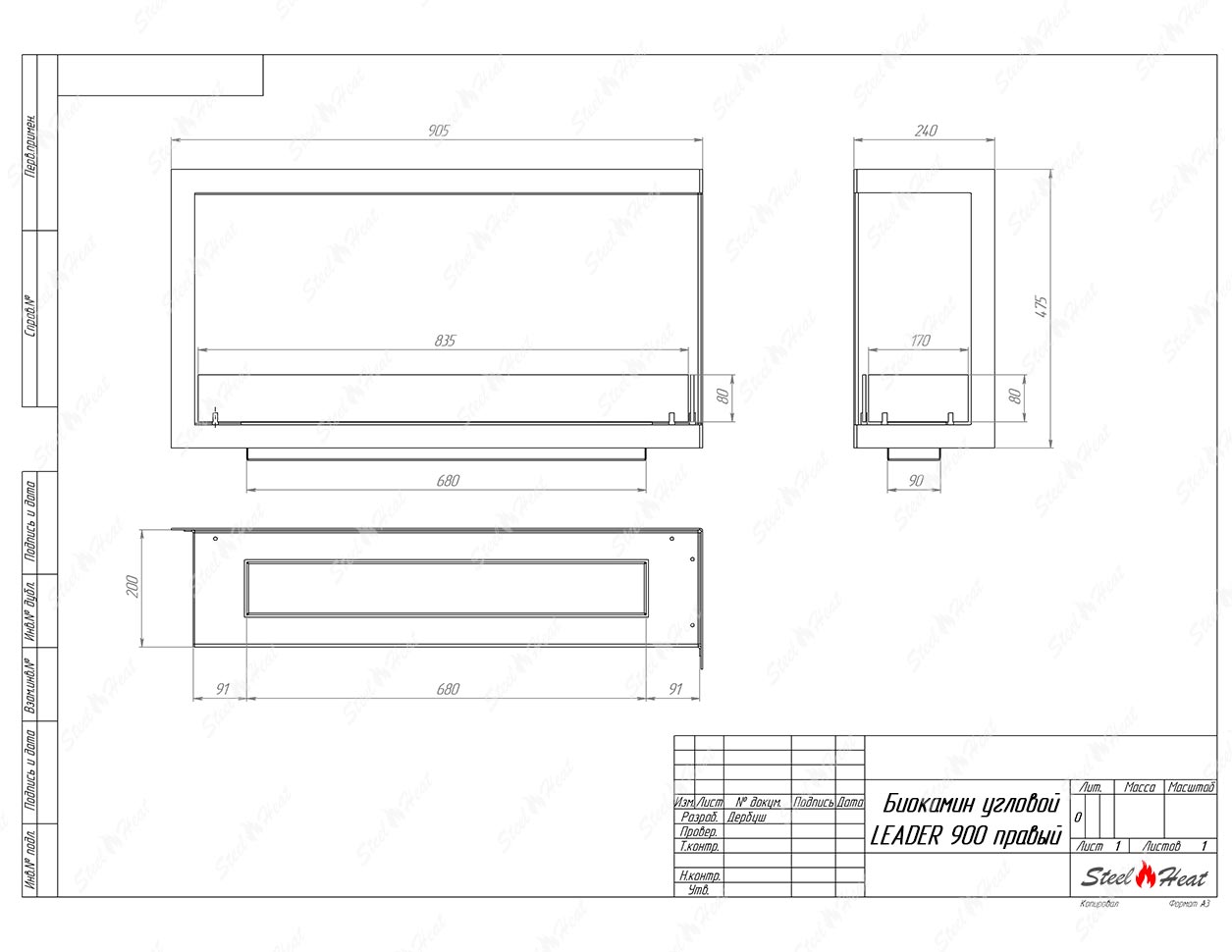 Встраиваемый Биокамин угловой SteelHeat Leader 900 правый предназначен для встраивания в глухие ниши из гипсокартона, кирпича, пеноблоков, бетона.