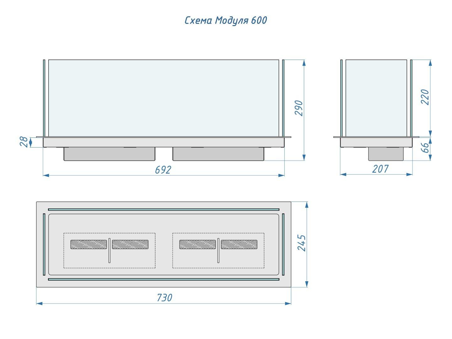 Конструкция Модуль 600 это цельная металлическая рамка, в которую помещается биотопливная горелка Lux Fire 600 c увеличенной лицевой панелью, обрамленная 4 закаленными стеклами.