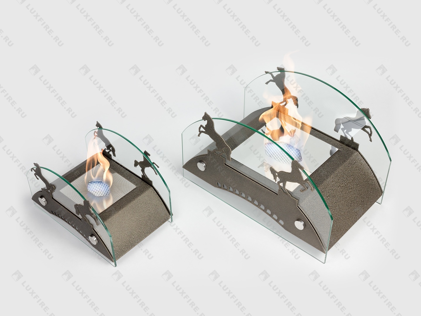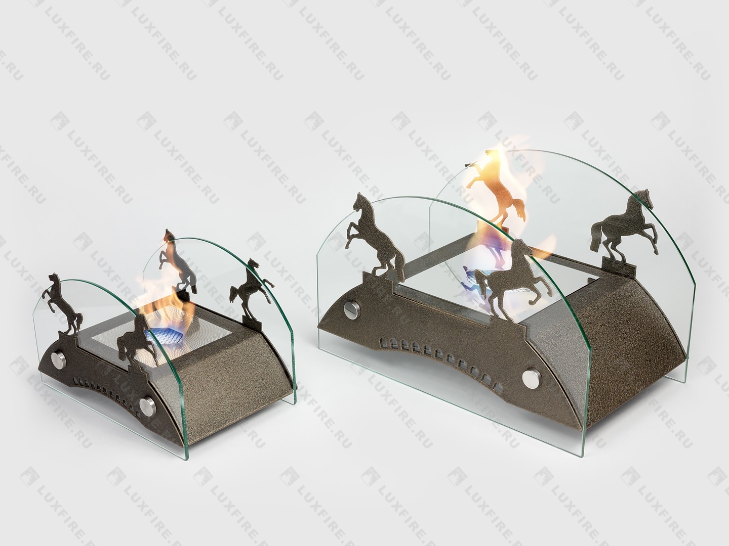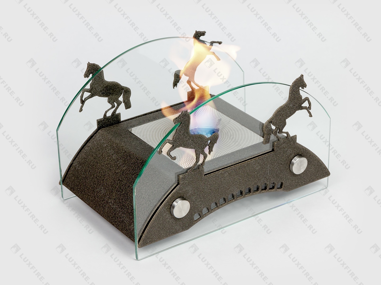 Представляет собой биокамин, который создан по мотивам мостов дореволюционной России середины ХIX-начала XX века и состоит из металлического корпуса с топливным блоком Lux Fire 100-1 огражденным с двух сторон скругленными защитными стеклами на дистанционных держателях и декоративными металлическими накладками в виде «Коней»