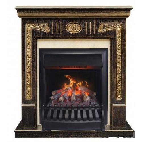 Фасад камина имеет П-образную форму, а сам портал сдвигается вглубь к кромке ниши ступенями. Привлекает камин тем, что он декоративными элементами не перегружен. Украшение его осуществляется при помощи плоскорельефной резьбы, украшенной позолотой. Это придает ему скромный, но при этом и эффектный вид. При своей стоимости этот камин способен конкурировать по качеству и внешнему виду с более дорогими моделями. Обусловлено это продуманным сочетанием расцветок и элегантным дизайном.