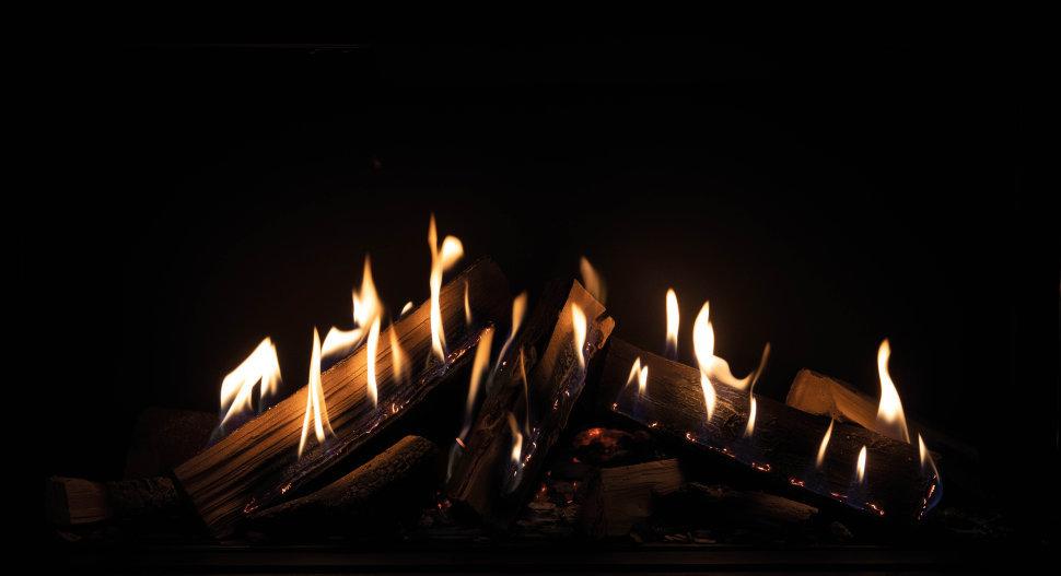 - Языки пламени вырываются непосредственно из керамических дров, сложенных в камере горения под углом в 45°, а мерцание тлеющих дров и золы под ними дополняют реалистичную картину огня.