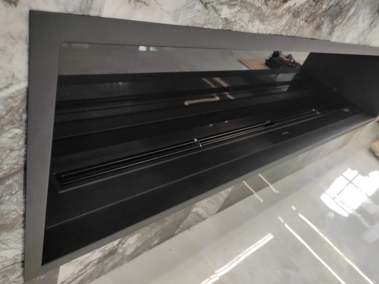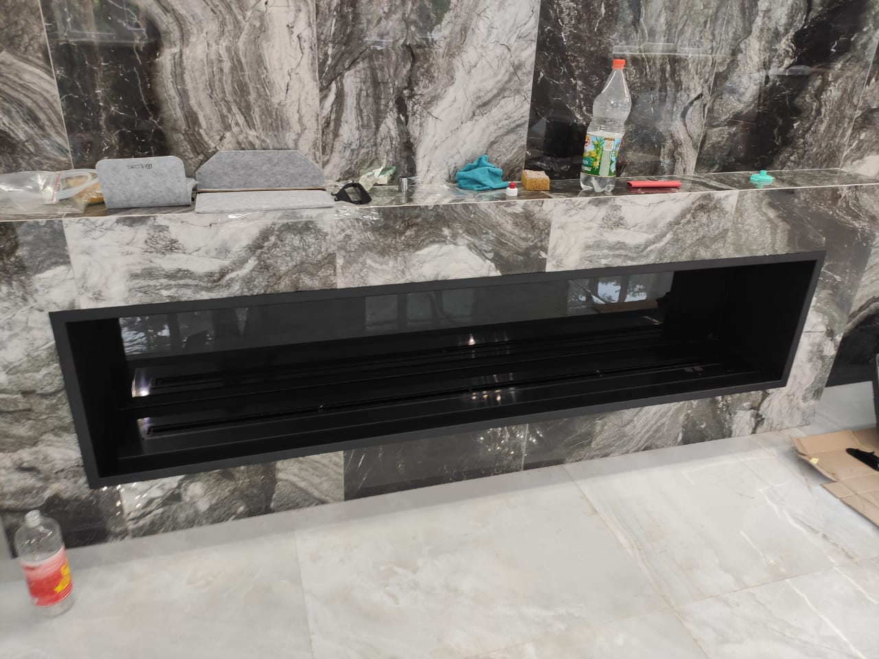 По проекту был спроектирован и изготовлен встраиваемый биокамин с автоматическим топливным блоком Airtone-Andalle 2400 мм. Корпус камина окрашен черной термостойкой краской муар. На внутренней поверхности камина наклеено черное стекло - стемалит.